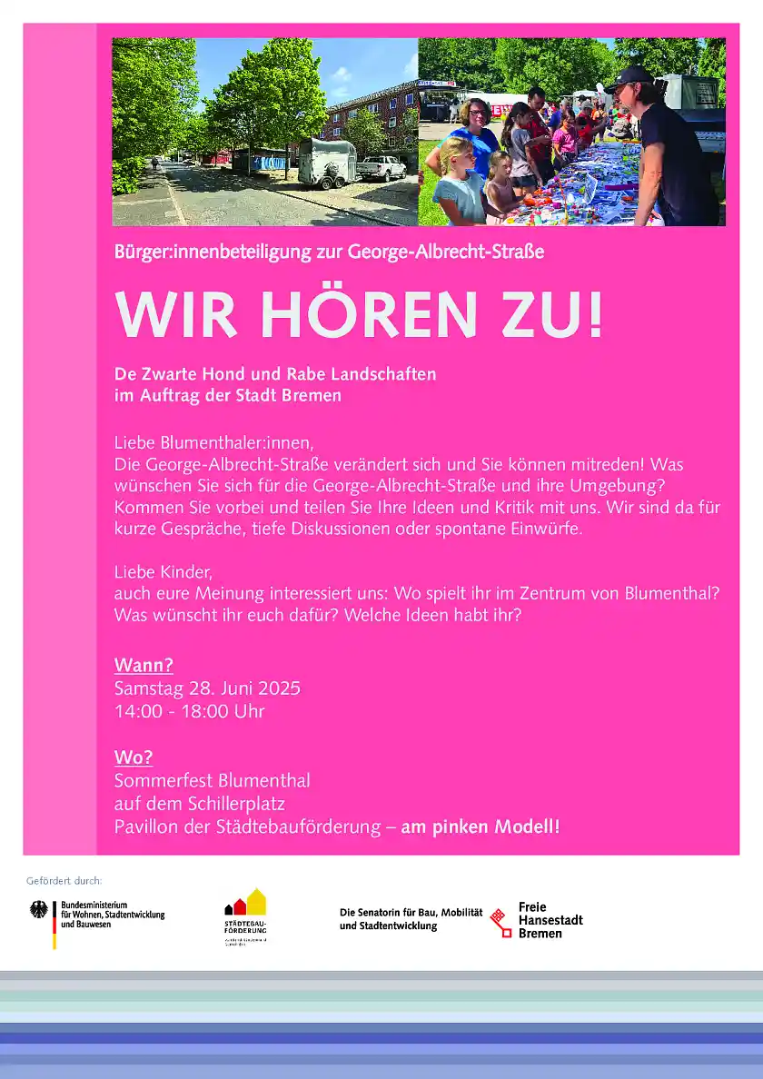 Die George-Albrecht-Straße verändert sich und Sie können mitreden! Was wünschen Sie sich für die George-Albrecht-Straße und ihre Umgebung? Kommen Sie vorbei und teilen Sie Ihre Ideen und Kritik mit uns. Wir sind da für kurze Gespräche, tiefe Diskussionen oder spontane Einwürfe.